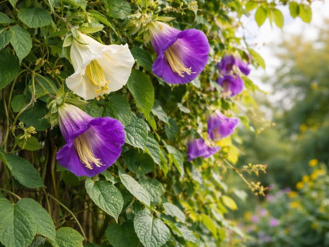 - Кобея: отличается крупными цветами-колокольчиками и способностью образовывать плотную зеленую массу. Выращивается из рассады, которая начинает цвести после пересадки.