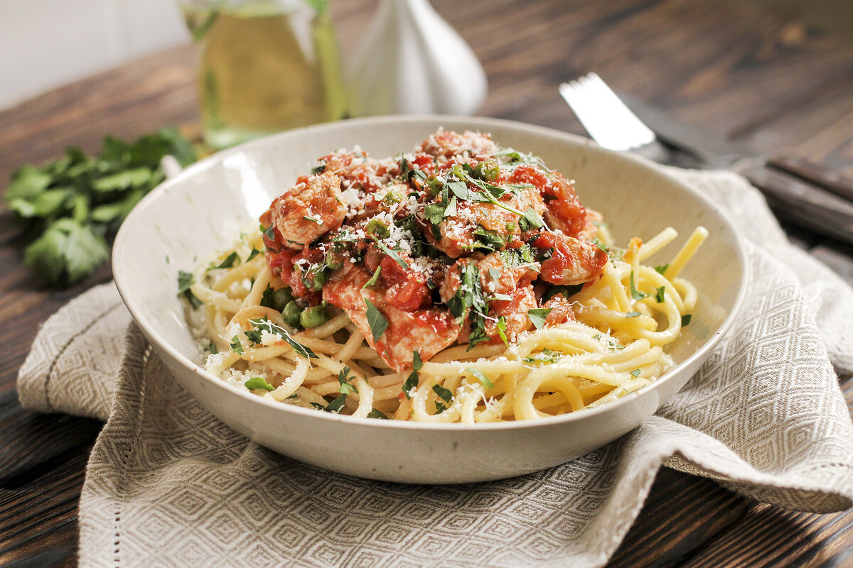 4. Подавайте спагетти, щедро присыпая сверху курицей, тертым пармезаном и оставшейся петрушкой. Блюдо лучше подавать горячим, и оно точно станет звездой вашего стола!