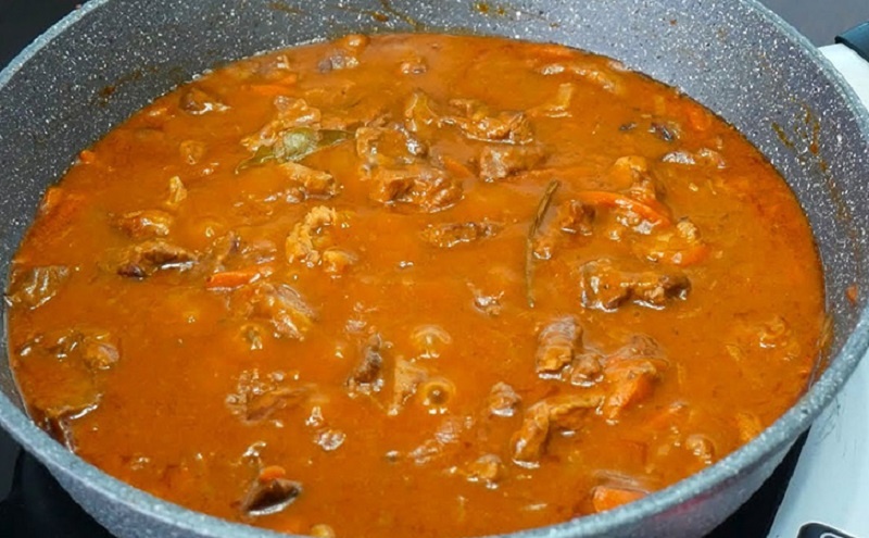 Говядину нужно обжаривать на разогретом растительном масле в один слой, чтобы она быстро схватилась снаружи, сохранив сочность внутри. После того как появится легкая корочка, добавляется лук. Он придаст блюду сладость и нежность. Когда лук станет золотистым, заливается горячая вода так, чтобы мясо почти утонуло, после чего огонь уменьшается, добавляется соль, и кастрюля накрывается крышкой. Тушение продолжится минимум сорок минут — именно в этот момент происходит магия приготовления.