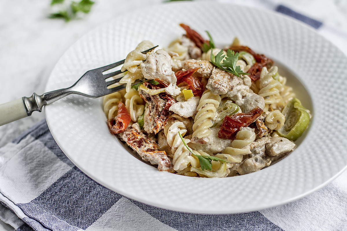 Шаг 2: На сковороде обжарьте лук порей до золотистого цвета (примерно 1-2 минуты) на среднем огне. Затем добавьте куриное филе и жарьте по 3-4 минуты с каждой стороны до появления румяной корочки. После этого добавьте чеснок и вяленые томаты, приправьте солью и перцем. Влейте сливки и доведите до загустения. Затем объедините пасту с соусом, хорошо перемешайте. Подавайте на тарелке, посыпанной свежей петрушкой. Наслаждайтесь!