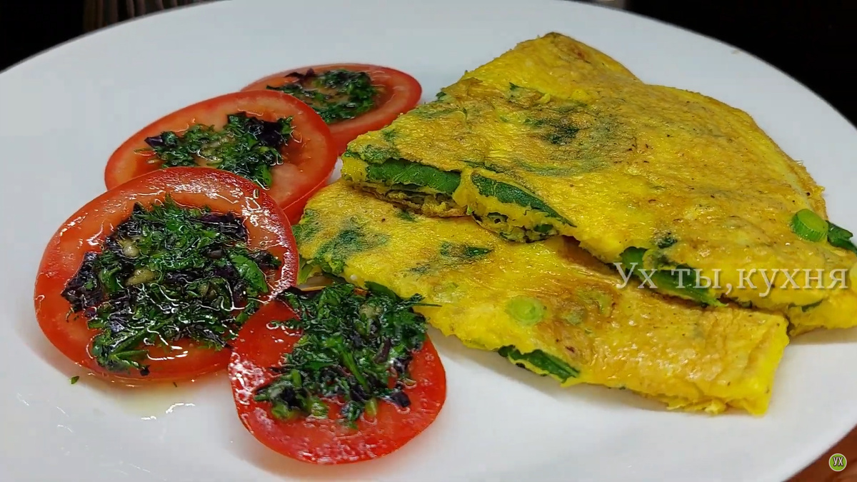 По готовности омлет нарезается, а помидоры настаиваются и готовы к подаче. Наслаждайтесь вкусом вместе!