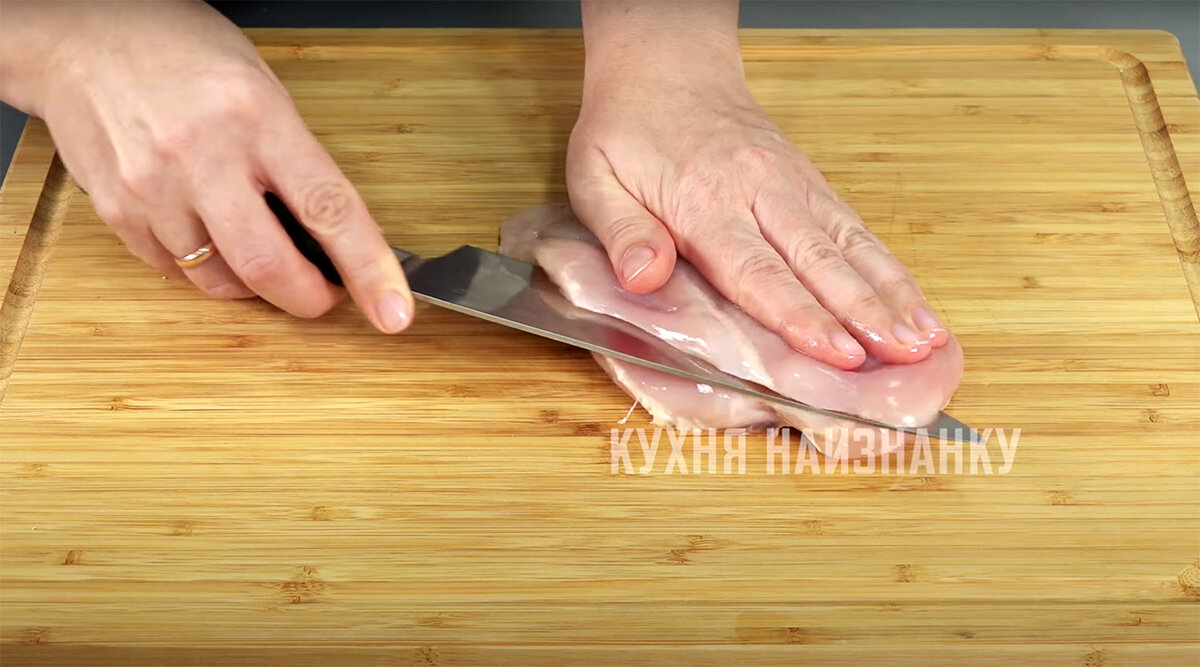 Приступая к приготовлению, куриное филе необходимо тщательно промыть и разрезать вдоль, после чего отбить. Для этого подойдет обычная пленка, которая поможет сохранить состав целым и избежать повреждений.