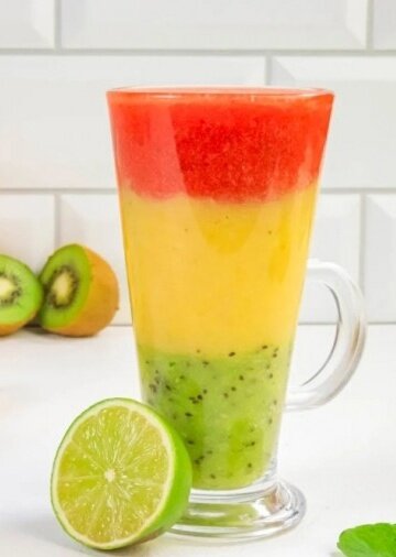 Теперь пора собрать ваше смуси! В высокий стакан поочередно вливайте пюре: сначала из киви и мяты, потом из апельсина с бананом, и в конце — из клубники. Чтобы слои остались четкими, действуйте аккуратно.