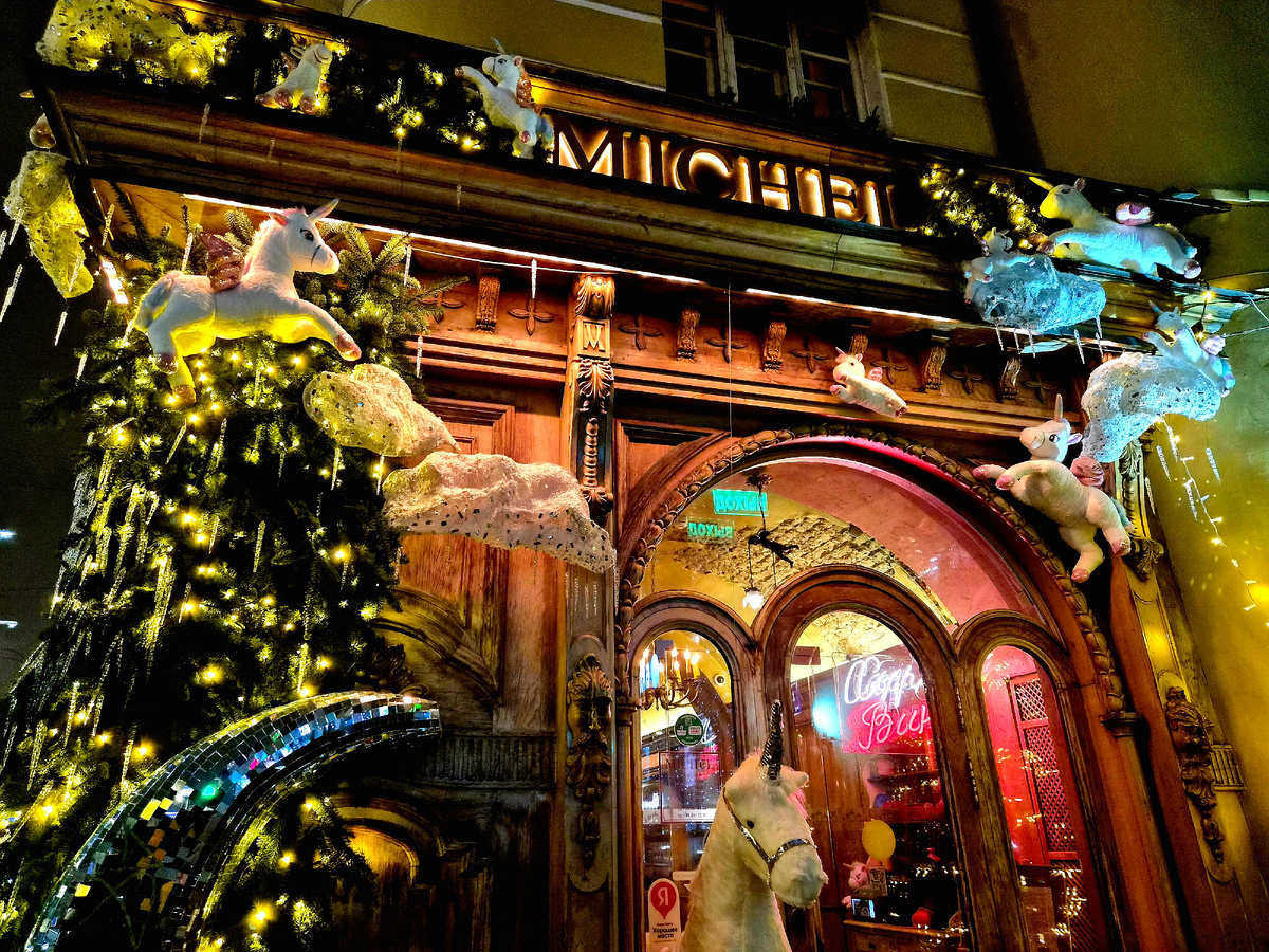 Ресторан «Мишель» заслуженно пользуется популярностью среди москвичей. Его уютный фасад с деревянной отделкой, красные окна и атмосферное освещение создают исключительный шарм. В этом году новый декор в виде единорогов добавил фантасмагории в уже знакомую обстановку, подчеркивая праздничное настроение.