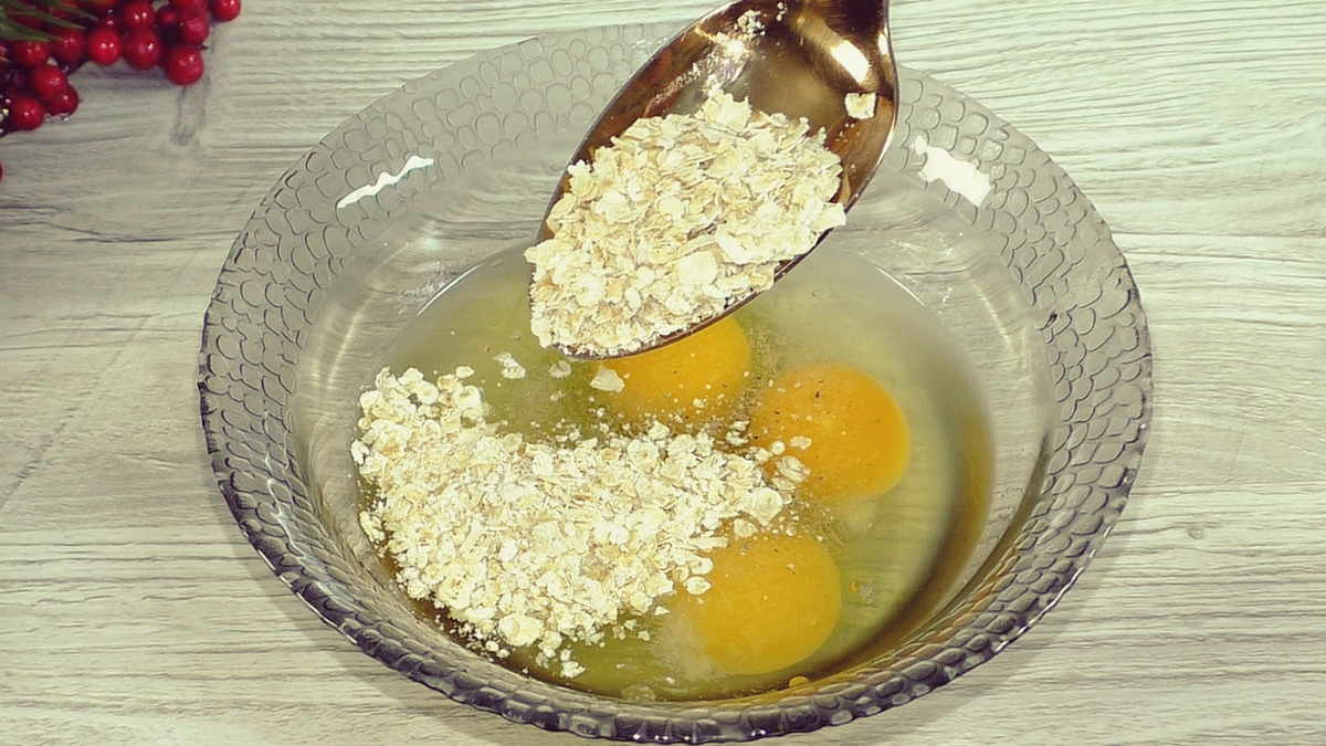 В глубокой миске смешайте яйца, добавьте соль и перец по вкусу, затем введите овсянку. Перемешайте эту смесь и отложите в сторону, пока подготавливаете остальные ингредиенты.