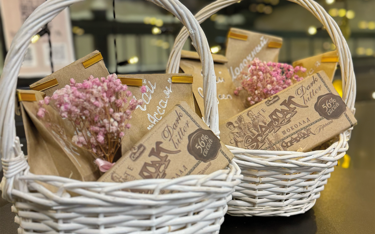 На площадках в Троицке можно приобрести интересные корзины, состоящие из трех видов ароматного чая, которые идут в комплекте с темным шоколадом. Не уступает по разнообразию и предложение на Профсоюзной улице: здесь можно найти тюльпаны из молочного шоколада, натуральный мармелад, а также наборы макарун и конфеты.
