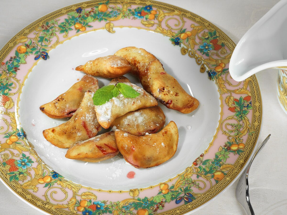 Для создания теста необходимо смешать 0,5 кг пшеничной муки с 430 г картофельного крахмала, добавить 4 яйца и хорошо перемешать руки. Постепенно влить холодную воду, начиная с одной столовой ложки, пока не получится однородная масса. Поместите комок на присыпанную мукой поверхность и тщательно замесите до состояния шелковистого теста, которое не прилипает к рукам. Накройте пленкой и дайте настояться 20 минут при комнатной температуре. Раскатайте в пласт толщиной 3 мм и нарежьте кружки диаметром около 8 см.В глубоком сковороде разогрейте рафинированное растительное масло на среднем огне.Слепите вареники, помещая в центр каждого кружка 3-4 замороженные вишни, посыпав сахаром и добавив немного выскобленных зерен ванили. Скрепите края теста.Опустите порцию вареников в горячее масло: через 3-4 минуты, когда они станут золотистыми, выньте их шумовкой и выложите на тарелку. Посыпьте сахарной пудрой перед подачей.Замены в рецепте