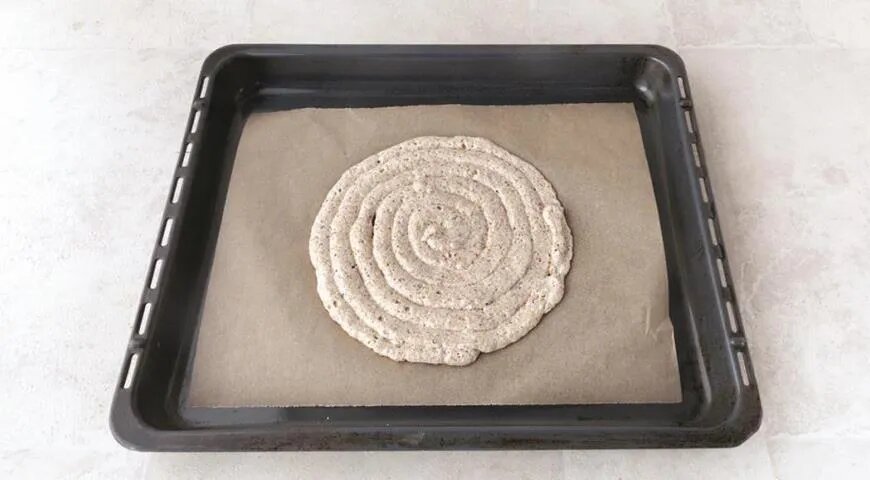 На пергаменте нарисуйте два круга диаметром 22 см, а затем переверните его на противень. Отсадите тесто по спирали и обсыпьте сверху сахарной пудрой. Оставьте на 10 минут, а затем повторите процедуру. Выпекайте коржи в течение 20–23 минут, после чего аккуратно снимите их с бумаги и остудите на решетке.
