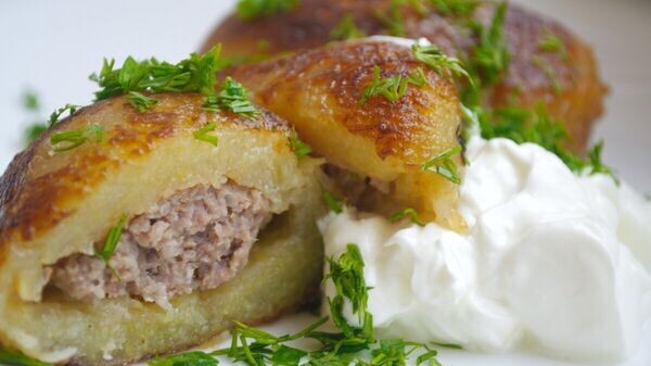 - Традиционный вариант: сырой картофель натирается и смешивается с мясом, затем масса формируется в пирожки и обжаривается до золотистой корочки.