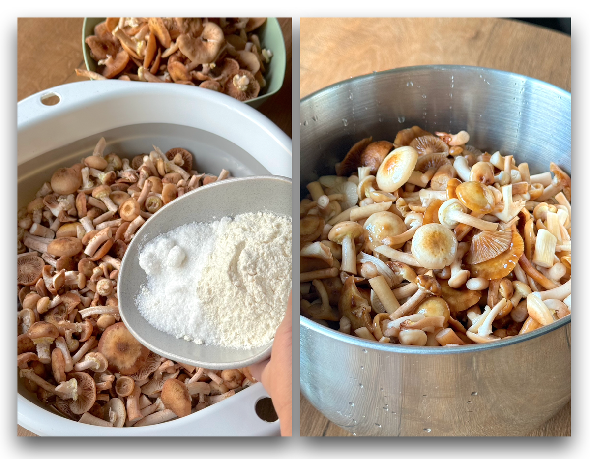 - Перемешивание: Грибы нужно тщательно перемешать в воде руками в течение нескольких секунд. Это поможет активировать действия соли и муки.