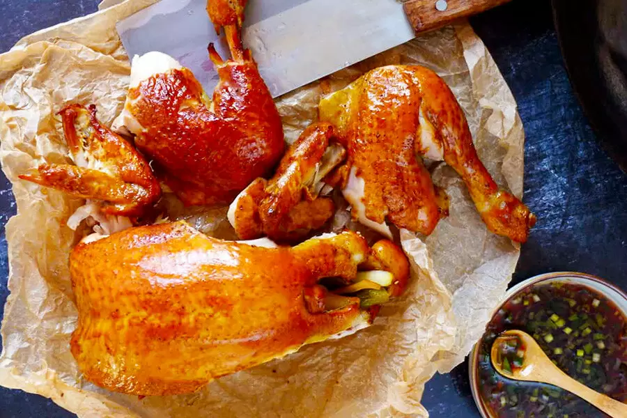 Цыпленка обвалять в смеси пяти специй и соли как снаружи, так и внутри. Внутрь положить крупно нарезанный имбирь и несколько стрелок зеленого лука. Оставить мариноваться на 4 часа или на ночь.Приготовить цыпленка на пару. Если пароварки нет, можно использовать глубокую сковороду с скомканными комочками фольги на дне и блюда, установленные сверху. Налить воду, не доходя до блюда, и после закипания положить цыпленка на грудку. Уменьшить огонь и готовить около 40-45 минут, следя за уровнем воды.После приготовления дать цыпленку немного остыть.Смешать все соусы и мед до получения однородной массы и обмазать цыпленка.В сковороду уложить фольгу, сверху коричневый сахар, чайные листья и рис. Перемешать и разогреть на среднем огне.Как только появится дым, положить решетку с цыпленком сверху и накрыть крышкой. Выключить через 8-10 минут.Переложить готового цыпленка на доску и сбрызнуть кунжутным маслом.Приятного аппетита!