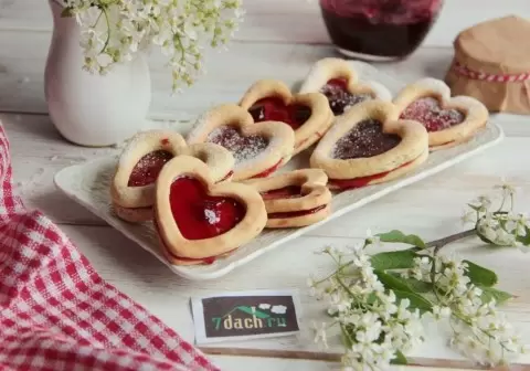 После охлаждения, на целые сердечки наносится слой конфитюра, а сверху накрываются печеньями с окошком, что создает эффект сэндвича с начинкой. В результате получается удивительное угощение для чаепития.