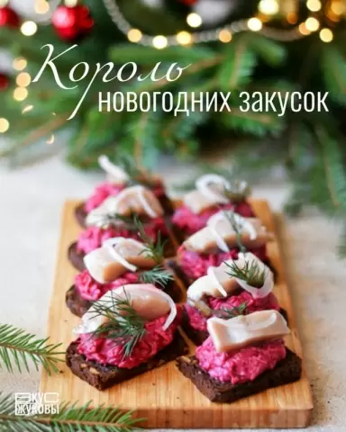 Выложить готовые закуски на широкую доску или белую тарелку. Рядом можно разместить дольки лимона для любителей кислого. Чтобы добавить ярких красок, разложите на блюде клюкву или гранат — их цвет будет идеально сочетаться со свекольной намазкой.