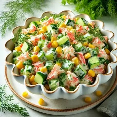 Переложите салат в стильную сервировочную миску или разложите по отдельным порциям. Для украшения используйте веточки укропа, что придаст не только эстетический вид, но и добавит аромата. Этот крабовый салат порадует не только вас, но и ваших близких, став изюминкой любого стола!