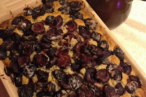 Для начала следует разогреть духовку до 200 градусов. Черешню нужно освободить от косточек и перемешать с 40 граммами пшеничной муки — это поможет ягодам не тонуть в тесте.