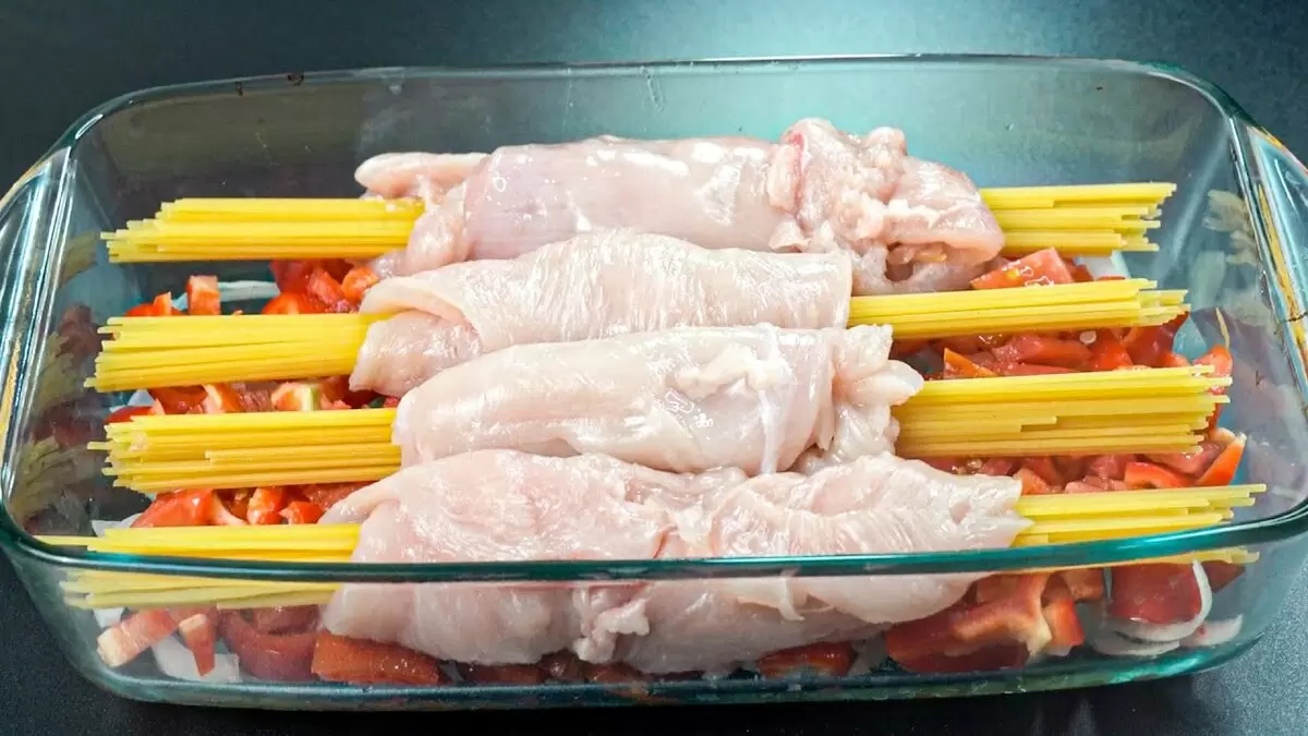 Теперь самое интересное: каждую порцию спагетти, количество 50 грамм, завернуть в куриное мясо. Важно придерживаться этих пропорций. Затем следует подготовить форму для запекания, смазав дно растительным маслом, и выложить сначала лук, затем перец и помидоры.
