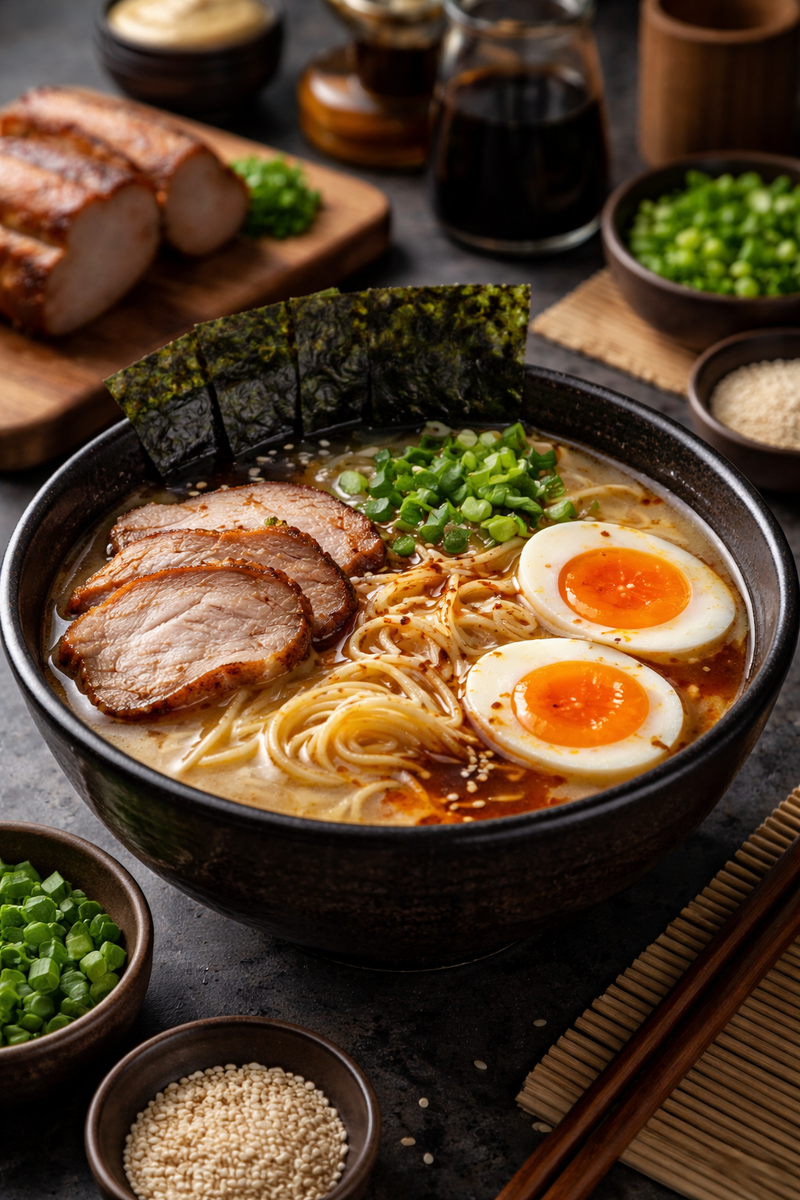 Секрет популярности рамэна прост: основной акцент сделан не на лапше, а на бульоне, насыщенном коллагеном и умами. Долгая варка позволяет экстрагировать белки, жиры и ароматы из костей и мяса, превращая бульон в густую, почти кремовую массу с многослойным вкусом.