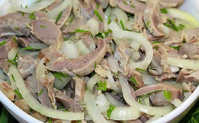 Пока они варятся, нарежьте лук и замочите его в смеси сахара, соли и уксуса. Это поможет убрать остроту, сохранив хрустящую текстуру. После того как желудочки сварились, нарежьте их мелко, соедините с луком и щедро посыпьте укропом. Чем дольше настаивается салат, тем более насыщенным становится его вкус.