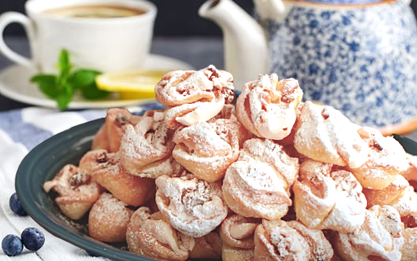 Разделите тесто на части, скатайте в бревна и нарежьте на кусочки. Каждый раскатайте в круг, добавьте безе и сложите. Уложите печенье на противень, добавив орехи внутрь. Выпекайте 25–30 минут до золотого цвета, остудите и посыпьте сахарной пудрой.
