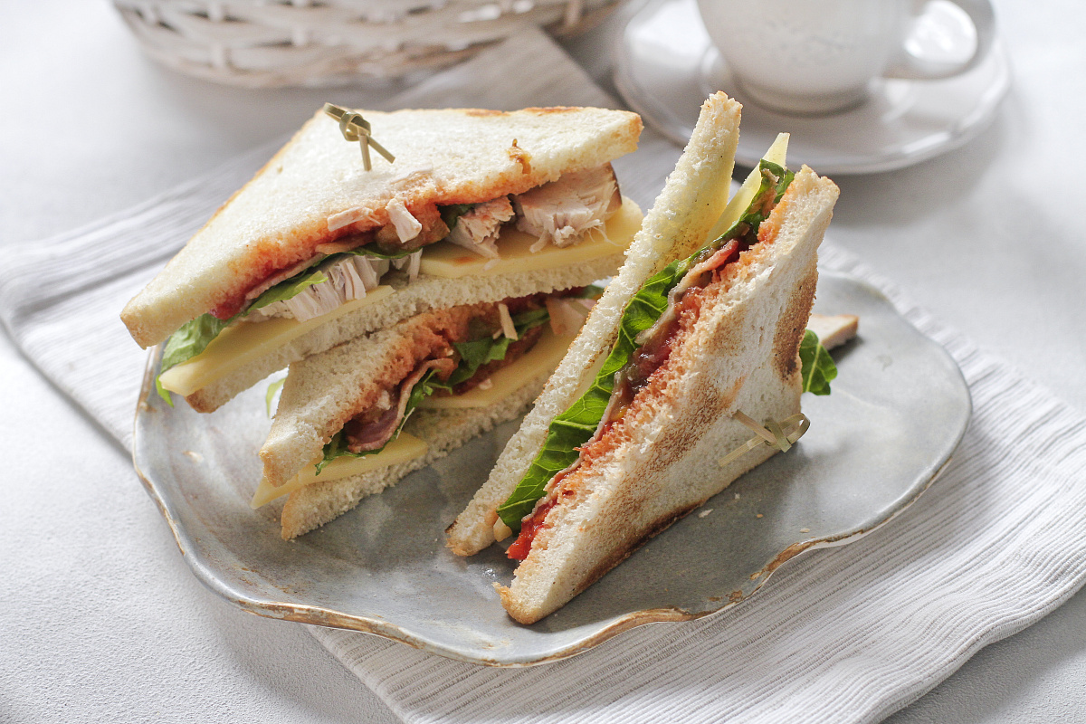 Шаг 3: На тост нанесите щедрый слой соуса лечо. Положите сверху индейку, бекон, листья салата и ломтики сыра. Накройте вторым тостом и заколите шпажкой. Повторите процесс с оставшимися ингредиентами. Подавайте сэндвичи немедленно и наслаждайтесь!