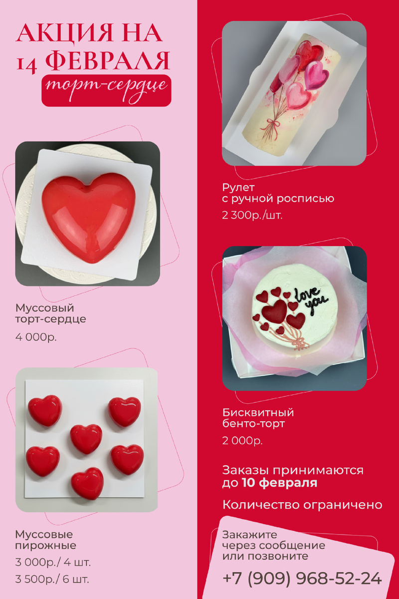 Не упустите возможность насладиться сладкими произведениями искусства! Заказы принимаются до 10 февраля, и количество десертов ограничено.