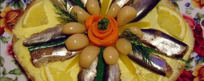 Нижнюю часть хлеба щедро промазываем маслом, при желании, можно посыпать зеленой рубленой травкой. Затем устанавливаем верхнюю часть, также смазываем ее маслом. Украшаем торт килькой, начиная с центра и добавляя соломку из болгарского перца, лесную зелень, дольки чеснока и лимона.