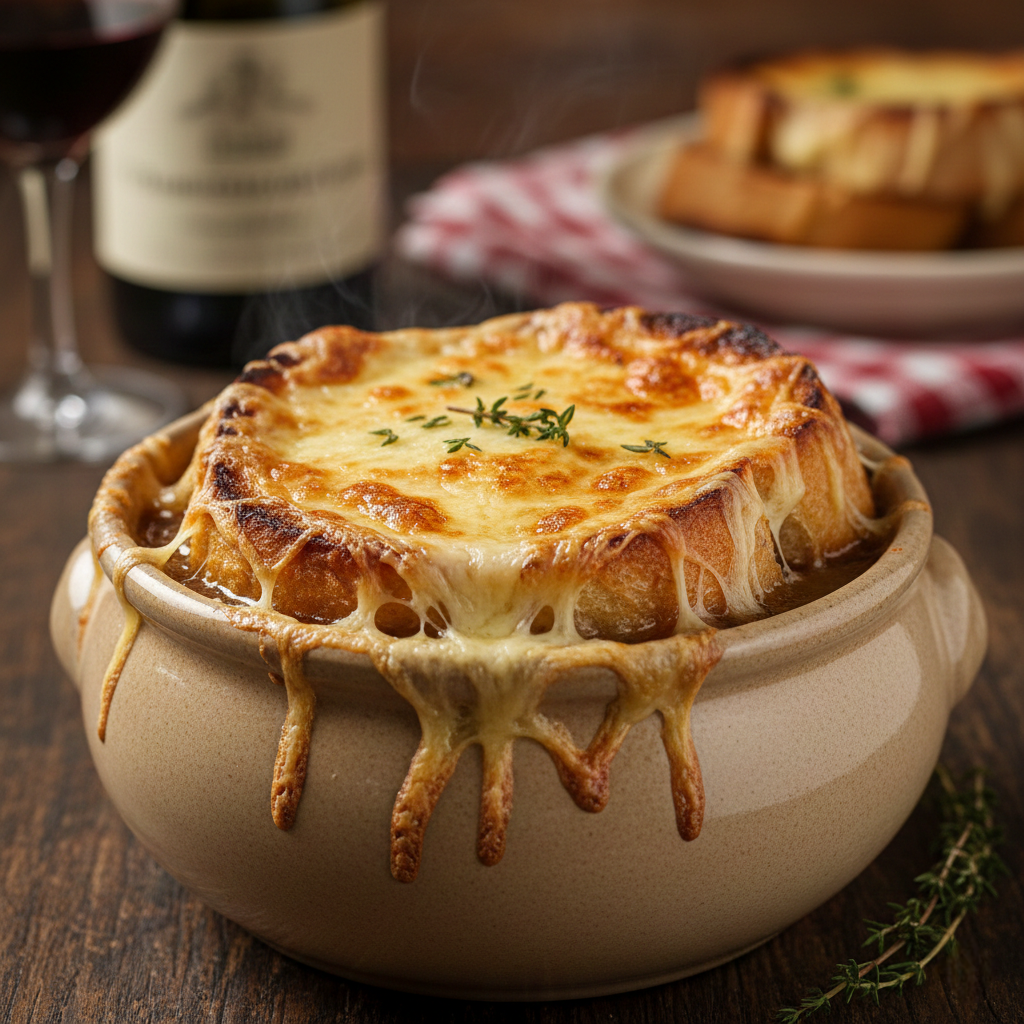 Когда-то этот суп был простым крестьянским блюдом, однако благодаря искусной карамелизации лука и насыщенному говяжьему бульону, он переквалифицировался в деликатес, который завоевал сердца гурманов и украшает меню лучших бистро мира. И, конечно, никуда не уходит знаменитая корочка из поджаренного хлеба и расплавленного сыра Грюйер, делающая блюдо просто незабываемым.