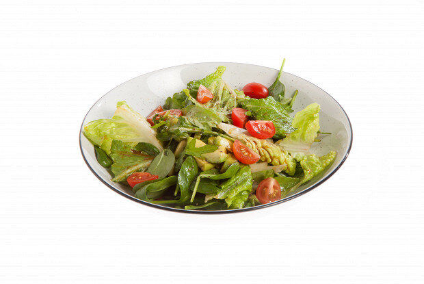 3. В глубокой миске нарвите листья салата романо, добавьте шпинат и руколу. Затем добавьте кубики авокадо и помидоры черри. Перемешайте все вместе, приправьте получившейся заправкой, поперчите по вкусу и подавайте к столу.