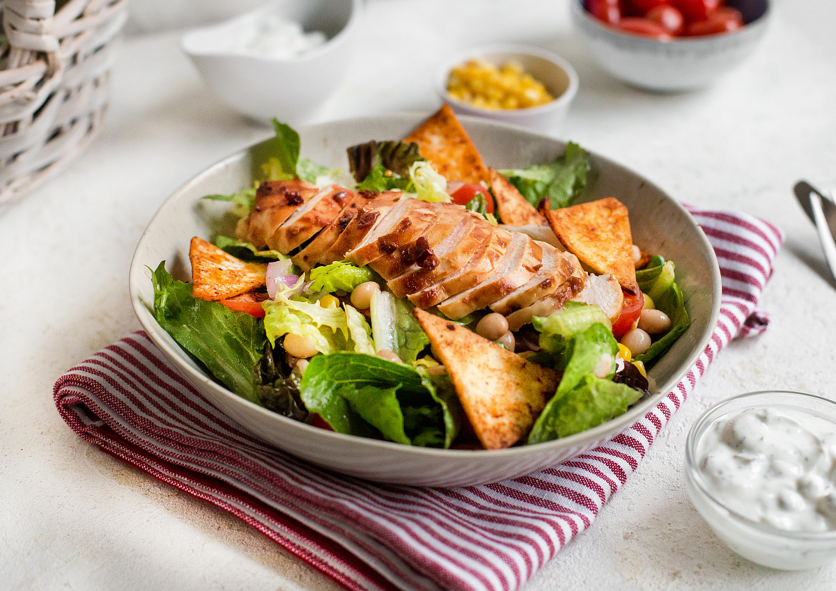 Сначала куриное филе нужно смешать с соусом барбекю. Тщательно перемешать и оставить мариноваться на 5-10 минут.Тем временем, разогрейте духовку до 200°C. На сковороде с 1 столовой ложкой растительного масла обжарьте курицу в течение 2-3 минут до золотистой корочки.Переложите курицу на противень, застеленный пергаментом, и запекайте в течение 10-15 минут.Укроп мелко нарезать, а йогурт смешать с укропом и добавить соль по вкусу.Нарежьте тортилью на небольшие треугольники и соедините её с паприкой, оливковым маслом и солью.После того как курица будет готова, добавьте тортилью к ней в духовку и запекайте еще 5 минут.Помидоры черри нарезать пополам, а потом соединить их с фасолью, кукурузой и салатной смесью.Заправьте всю смесь йогуртовым соусом и аккуратно выложите сверху запечённую курицу и чипсы из тортильи.Для альтернативного варианта: можно обжаривать курицу на сковороде 7-8 минут до полной готовности, а затем оставить под крышкой на 5-6 минут. Тортилью обжарить на сухой сковороде по 1-2 минуты с каждой стороны для ещё большей хрусткости.