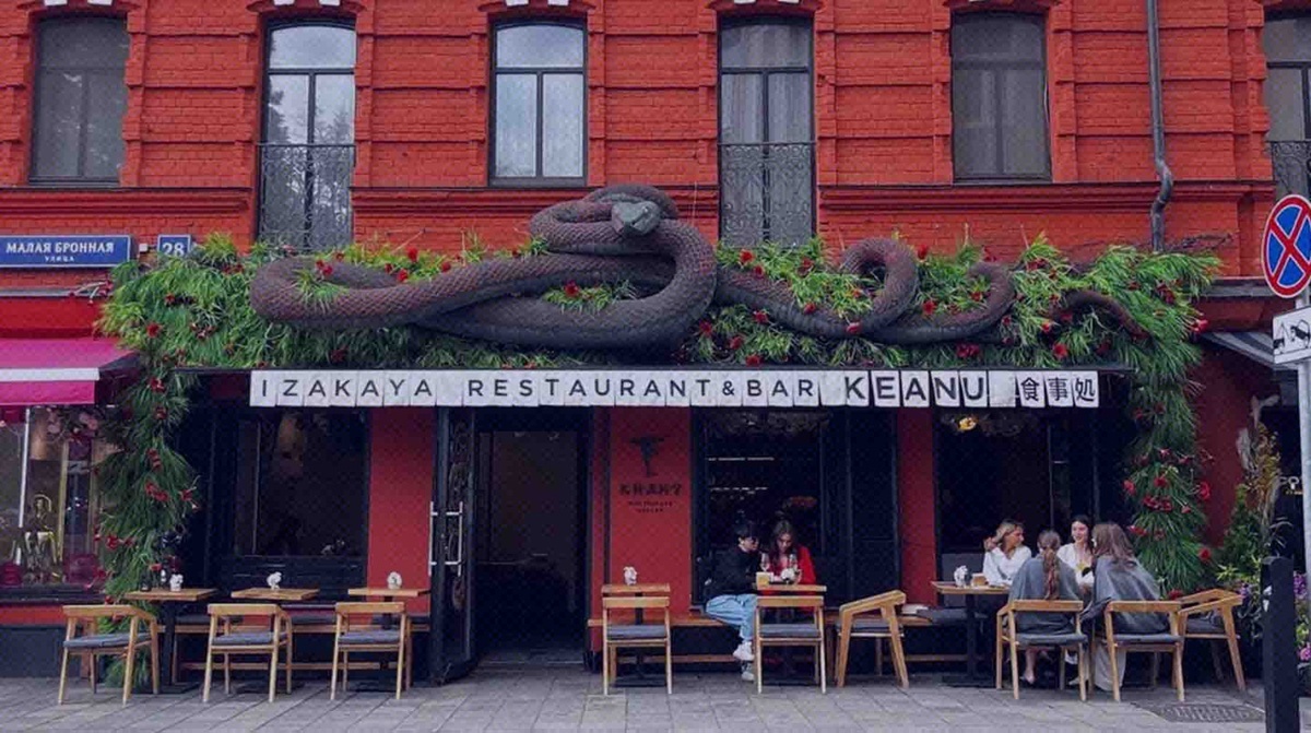Гендиректор бара с японской кухней, Максим Федорук, также решил подчеркнуть восточный символ этого года. Он и его команда разместили восьмиметровую змею на крыше своего заведения, обрамив ее елями и эффектной подсветкой. Этот необычный акцент помогает выделить их ресторан среди городского ландшафта.