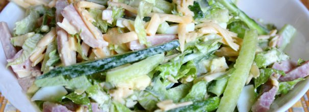 Нарезать ветчину тонкой соломкой и положить в большую миску, что облегчит последующее перемешивание.Свежие огурцы вымыть, обсушить и также нарезать соломкой. При наличии жесткой или горькой кожуры, ее стоит удалить.Натереть сыр на крупной терке или нарезать его соломкой, как вам удобнее.Из вареных яиц два штуки натереть на крупной терке; они также понадобятся для украшения салата.Свежую зелень мелко нарубить и добавить к остальным ингредиентам.Пекинскую капусту нарезать широкими полосками или порвать на небольшие кусочки и отправить в миску.Чеснок нужно измельчить и смешать с несколькими столовыми ложками майонеза. Затем заправить салат этой смесью, аккуратно перемешивая.Добавлять заправку постепенно, по одной ложке, чтобы контролировать количество соуса.При подаче украсить порционное блюдо четвертинками вареного яйца и посыпать свежей зеленью.Салат «Моника» с ветчиной и сыром — это простое, но невероятно вкусное блюдо, которое придется по вкусу как домочадцам, так и гостям. Приятного аппетита!