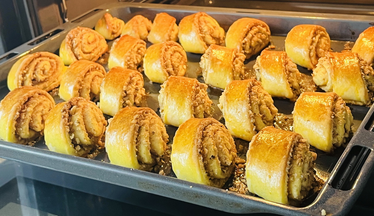 Поместите рулеты на противень, предварительно смазанный маслом, и запекайте в разогретой до 180 градусов духовке в течение 20 минут. Как только они подрумянятся, пора наслаждаться ароматной выпечкой вместе с чаем!