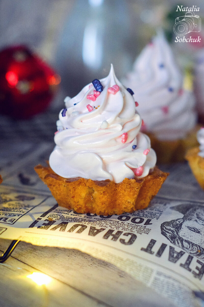 Заполните центральную часть корзинок абрикосовым джемом и аккуратно добавьте белковый крем сверху, придавая ему желаемую форму.