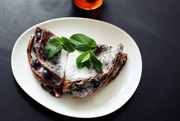 В глубокой миске взбить яйца с сахаром до получения однородной массы. Затем добавить молоко, кефир, соду и соль. Постепенно вмешивать пшеничную и черемуховую муку, чтобы избежать образования комков.Разогреть сковороду, добавив 1–2 чайные ложки оливкового масла. Налить в центр сковороды необходимое количество теста и наклонить сковороду, чтобы тесто равномерно распределилось.Когда края блина начнут коричневеть, аккуратно подцепить его лопаткой и перевернуть. Готовые блины переложить на тарелку.Каждый блин щедро намазать кремом маскарпоне, распределить голубику и сложить пополам, а затем еще раз пополам или свернуть в рулет. Посыпать сахарной пудрой и украсить веточками мяты перед подачей.Этот простой, но оригинальный рецепт придаст особый шарм любому столу. Попробуйте и порадуйте себя и близких чем-то новым и необычным!