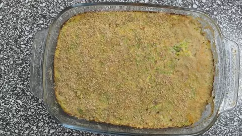 Форма для запекания смазывается растительным маслом и обсыпается сухарями, после чего выкладывается кабачковая масса. Сверху также посыпается сухарями или тёртым сыром, если это допустимо по диете.