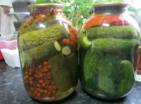 Первоначально стоит подготовить банки: их необходимо основательно вымыть и простерилизовать. Затем приступаем к наполнению: огурцы помещаются в банки вместе с рябиновыми гроздьями. Не забудьте, что грозди рябины должны составлять минимум 3-4 на банку. Это придаст вашему лечению более необычный и насыщенный вкус.