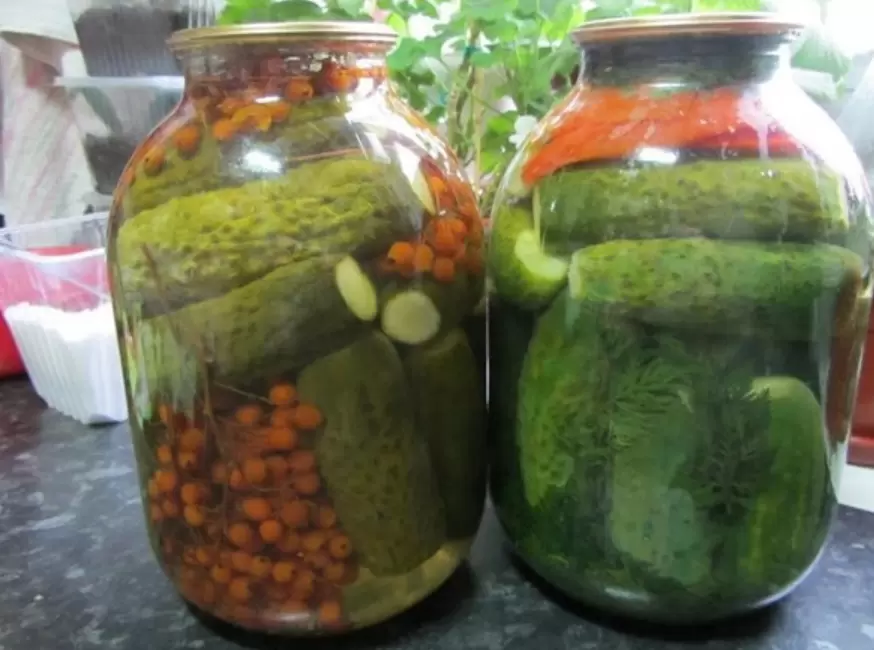 Затем слить воду и залить огурцы вторично кипятком, оставив на 15 минут для пропитки. После этого необходимо вновь слить воду. На 1 литр воды добавляется: 1 столовая ложка соли и 3 столовых ложки сахара. Получившийся маринад нужно прокипятить, добавить уксус, довести до кипения и заливаете в банки с огурцами и рябиной.