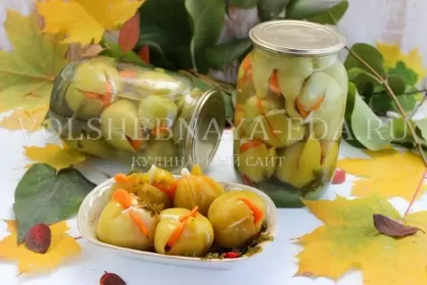 Эта закуска будет готова уже через пару дней, но для максимального вкуса подождите две недели. Зеленые помидоры, фаршированные морковью и чесноком, подарят вам незабываемые гастрономические впечатления!