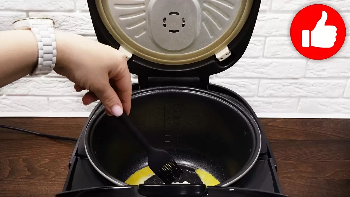 1. Взбить одно яйцо с щепоткой соли до однородной массы. В чашу мультиварки влить половину столовой ложки масла и установить режим "жарка". Дождаться звукового сигнала, чтобы убедиться, что мультиварка достаточно прогрелась.