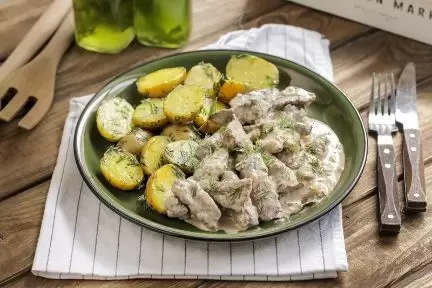 Мелко нарежьте укроп и добавьте его к готовому картофелю вместе со сливочным маслом. Хорошо перемешайте и подавайте с говядиной в сметанном соусе, пока блюдо горячее.