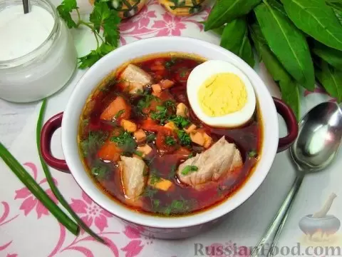 Зелёный борщ со свиными рёбрышками: В этот сезон обязательно стоит попробовать яркий борщ со свеклой и щавелем, подчёркнутый великолепным ароматом свежей зелени.