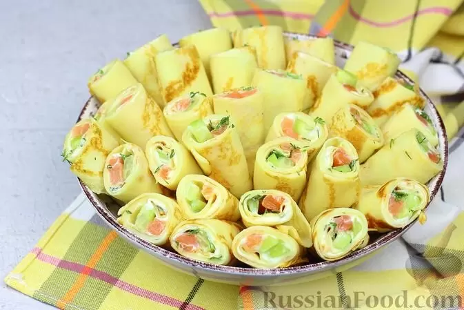 - Блины с сёмгой и огурцом: Тонкие блинчики с нежной начинкой из слабосолёной сёмги и свежих огурцов, идеально оформленные в рулетики.