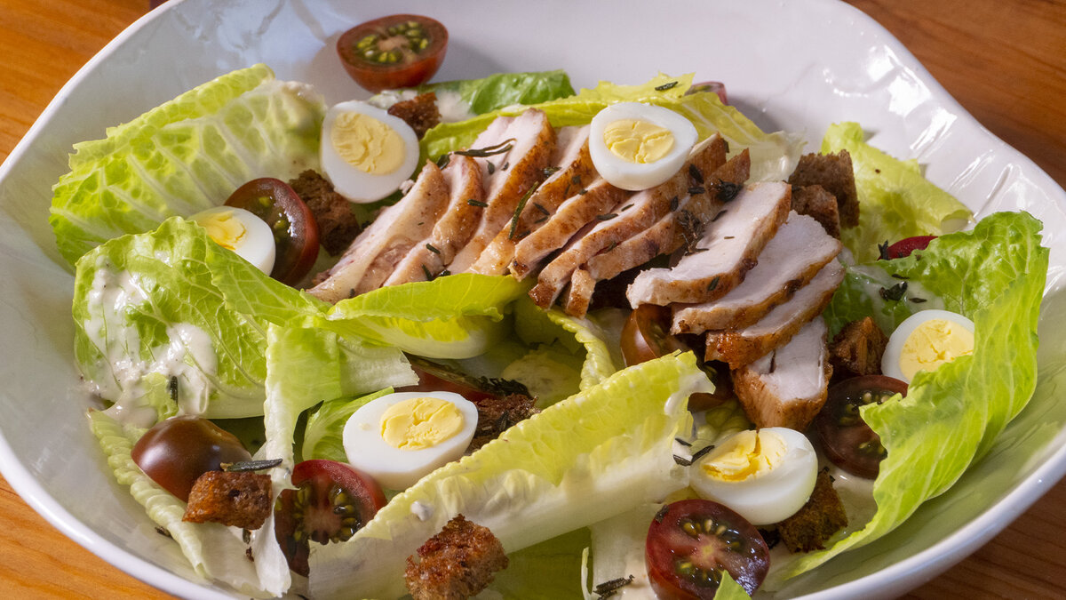Теперь рвем листья салата на кусочки и обвязываем их полученным соусом. Поверх салата укладываем половинки томатов черри и обжаренные гренки. Завершите салат запеченной куриной грудкой, нарезанной тонкими слайсами.